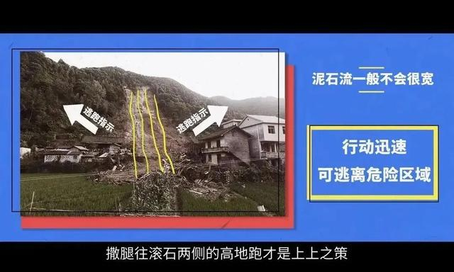 - 若突遇泥石流、山体滑坡,不要顺着河沟方向往上游或下游跑,应向与洪流方向垂直的两边山坡上爬。