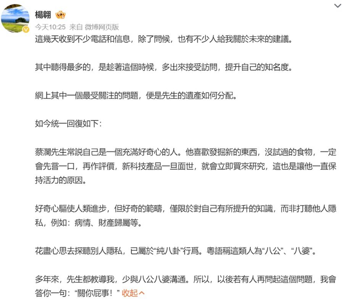 杨翱表示,近期网上最受关注的问题便是先生的遗产如何分配。如今统一回复如下: