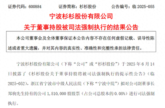 红星资本局6月29日消息,杉杉股份(600884.SH)6月27日发布公告,浙江省宁波市中级人民法院拟对公司副董事长郑驹持有的公司181万股股票(占公司总股本的0.08%)进行司法强制执行。本次执行后,郑驹不再持有公司股份。