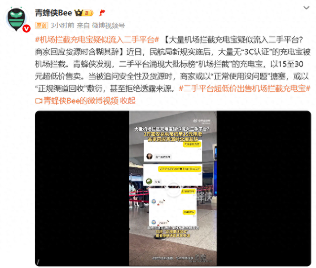 近日,民航局新规实施后,大量无“3C认证”的充电宝被机场拦截。青蜂侠发现,二手平台涌现大批标榜“机场拦截”的充电宝,以15至30元超低价售卖。