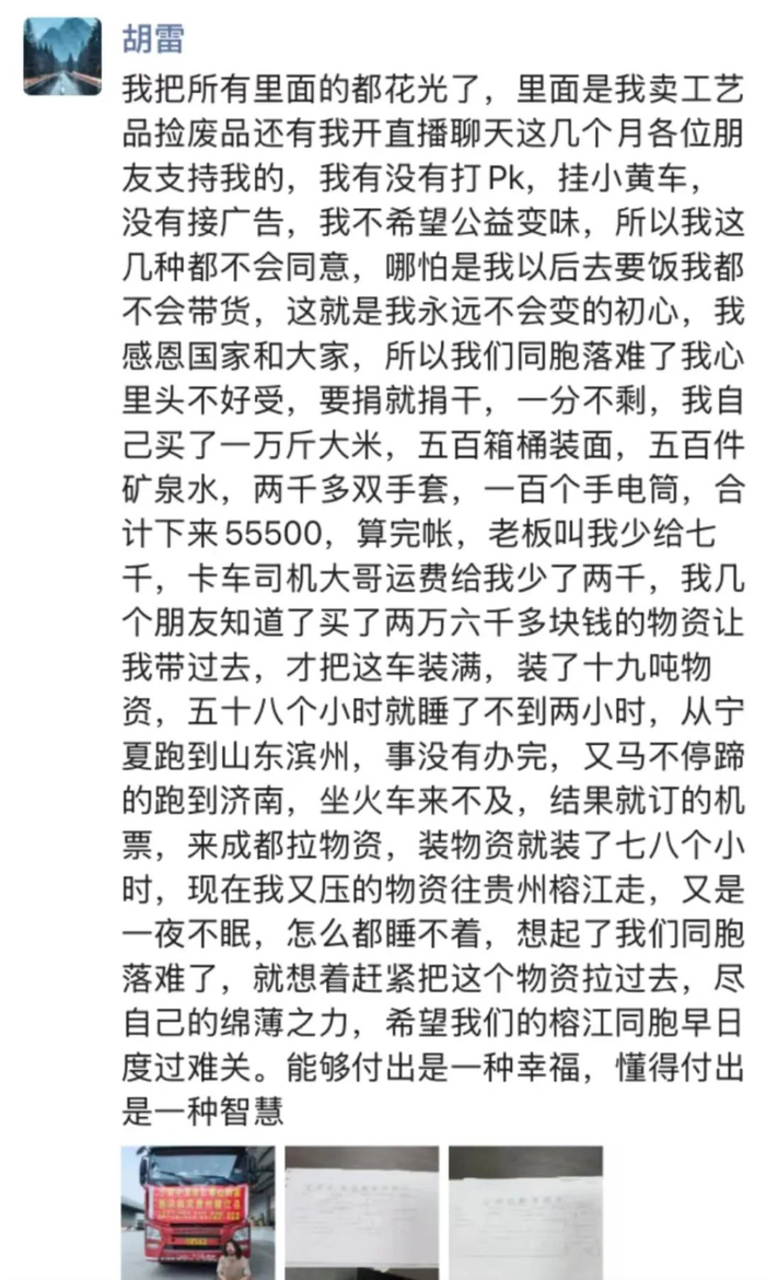 刚刚,贵州榕江发布洪灾物资领取地点!“跪行巨人”胡雷带物资已抵达榕江:靠捡废品卖工艺品开直播攒下的全部存款购买了急需品