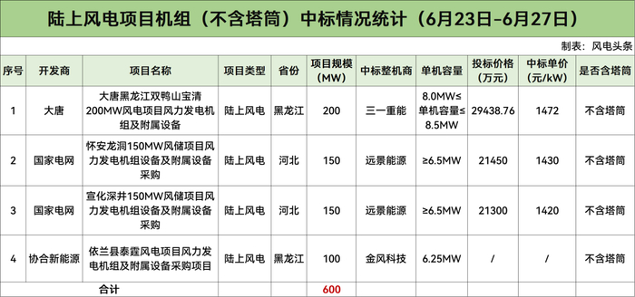 陆上含塔筒最低1800元/kW、不含塔筒最低1420元/kW!本周1.65GW风机开标!【风电项目·周分析】