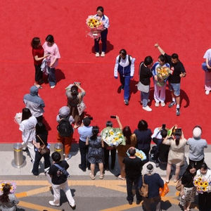 资料图:6月10日,北京市首师大附中通州校区考点外,考生走出考点接受亲人的祝福。中新社记者 杨可佳 摄
