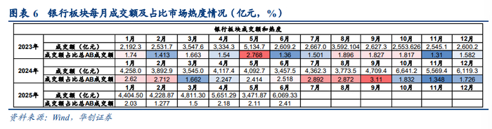 2025年6月陆家嘴论坛释放资本市场改革信号,如注册制深化、中长期资金入市等,提升市场信心,银行月成交额大幅上涨74.8%至6069亿元。6月成交同比上升75.5%,占比AB市场总成交额2.41%,较上月占比提升0.3pct。红利板块交易仍较多。