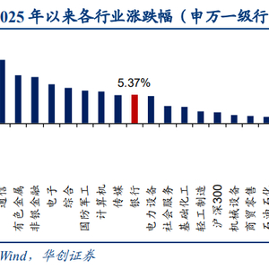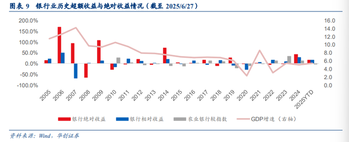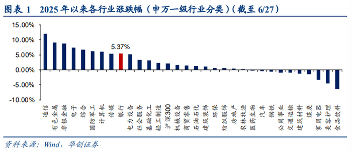 2025年6月1日至6月27日,银行业累计上涨5.37%,跑赢沪深300指数3.25pct,涨跌幅在31个申万一级行业中排名第9。