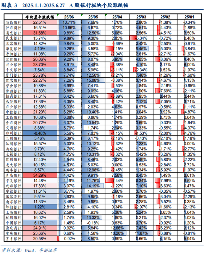 截至6月28日,6月以来A股银行个股中涨幅靠前的是浙商银行(10.71%)、沪农商行(10.66%)、浦发银行(9.89%)、民生银行(9.89%)、北京银行(9.84%)。6月主要是前期低估且高股息的股份行及城农商行领涨,而前期涨幅居前的银行本月涨幅较小,比如杭州银行、中国银行、渝农商行、重庆银行和齐鲁银行。