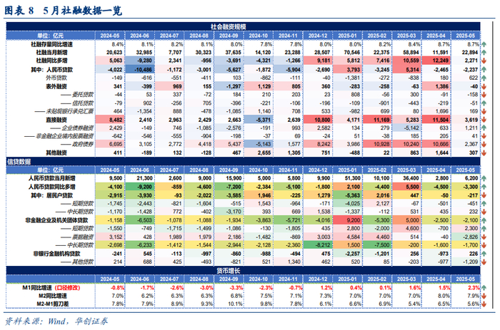 行业数据:直接融资占比上行,信贷呈现结构性分化。5月社融数据延续4月情况,仍然是政府债起主要支撑作用。5月社融保持8.7%较高增速,新增2.3万亿,同比多增2271亿元。直接融资与间接融资同比仍是“一增一减”,分别同比多增3619亿,同比少增3300亿元。一方面是外部存在较大不确定性,且一季度企业抢出口、消费补贴前置居民消费需求导致二季度开始信贷需求后劲不足;另一方面是直接融资对信贷需求具有替代效应。不过直接融资更多替代的是企业端的信贷融资需求,对于居民端的影响较小。居民贷款同比少增217亿元,其中居民短贷/中长贷分别同比少增451亿元/多增232亿元,居民中长贷净增长或主要由于按揭提前还款量下降。根据中指研究院,5月百强房企销售额同比下降17.3%,较4月降幅扩大0.5pct,重点城市二手房成交量环比季节性回落。我们认为,信贷需求企稳回升仍需时间,未来更多地呈现结构性分化的局面。