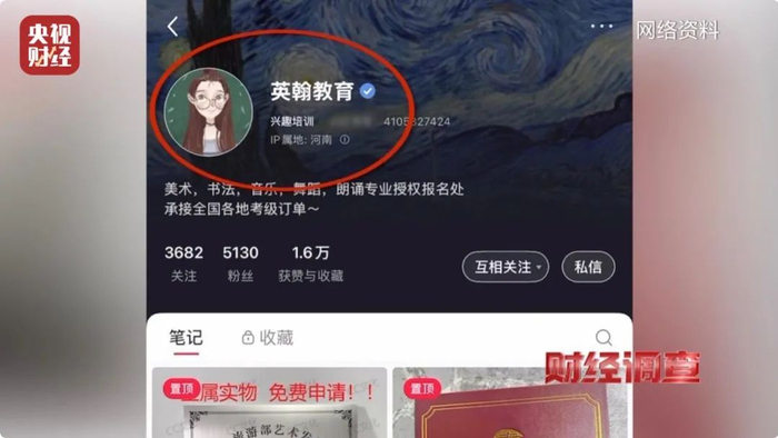记者输入“少儿舞蹈考级”“社会艺术水平考级”等关键词后,网络上瞬间涌现大量信息。一个名叫英翰教育的博主,其主页发布了大量艺术类师资证、考级、比赛的“合作帖”。