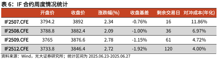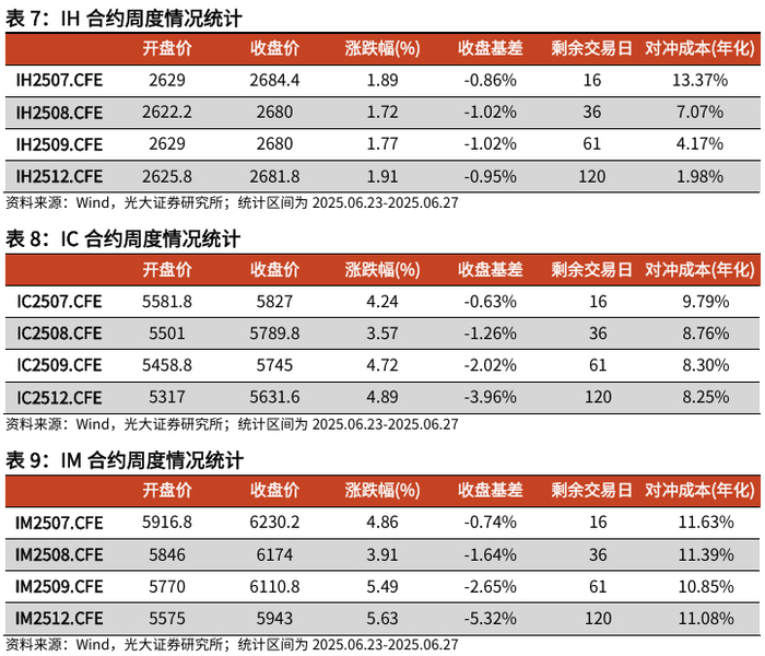 本周IF当月合约上涨2.34%,收于3892,收盘基差-0.76%;IH当月合约上涨1.89%,收于2684.4,收盘基差-0.86%;IC当月合约上涨4.24%,收于5827,收盘基差-0.63%;IM当月合约上涨4.86%,收于6230.2,收盘基差-0.74%。