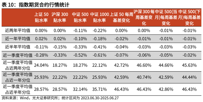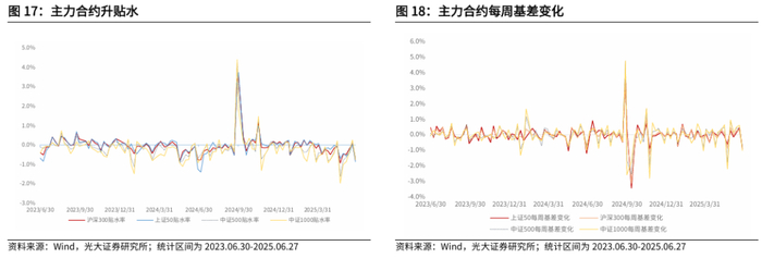本周上证50、沪深300、中证500、中证1000指数期货主力合约贴水率环比上一交易周下降。IF当月合约近一季度平均每周基差变化-0.06%,相比于近半年的-0.03%环境变差。IH当月合约近一季度平均每周基差变化-0.07%,相比于近半年的-0.04%环境变差。IC当月合约近一季度平均每周基差变化-0.05%,相比于近半年的-0.03%环境变差。