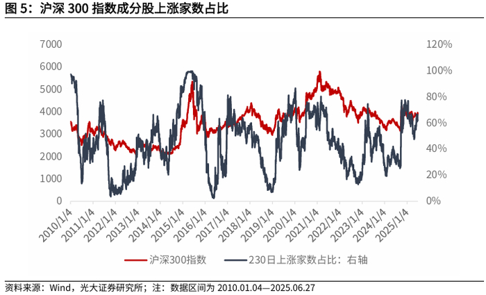 我们发现,该指标可以较快捕捉上涨机会;同时,由于选择在市场过热阶段提前止盈离场,也会错失市场持续亢奋阶段的上涨收益。指标在对下跌市场的判断也存在缺陷,难以有效规避下跌风险。截至2025年6月27日,该指标最近一周小幅下降,上涨家数占比指标目前高于60%,市场情绪较好。
