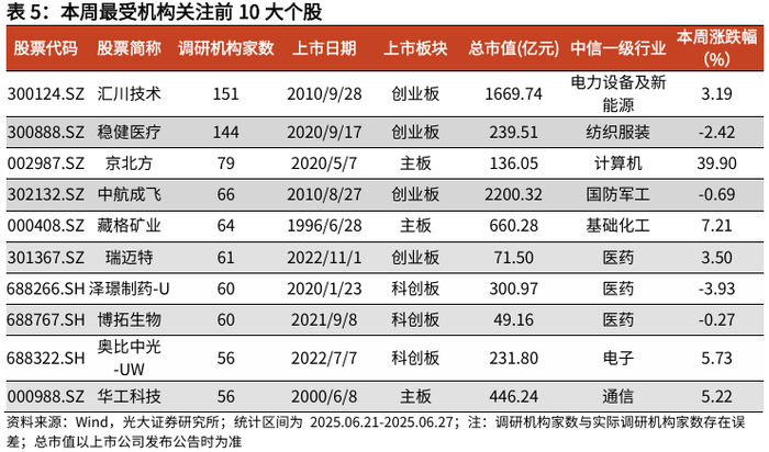 从个股来看,本周受到机构关注程度最高的前5大个股依次为汇川技术(151家)、稳健医疗(144家)、京北方(79家)、中航成飞(66家)和藏格矿业(64家)。