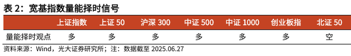 从量能择时信号来看,截至6月27日,除北证50外,其余指数量能择时信号均为看多观点。