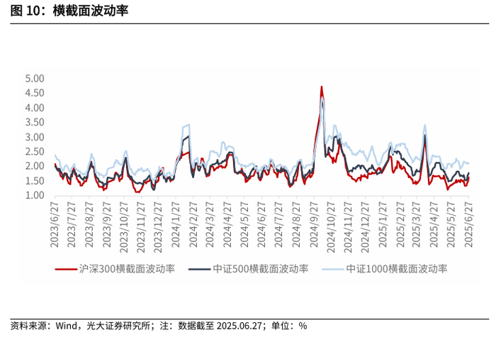 时间序列上来看,最近一周沪深300、中证500、中证1000指数成分股时间序列波动率环比上周上升,Alpha环境好转。