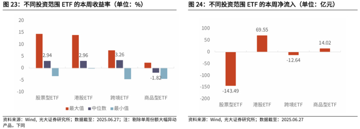 股票型ETF本周收益中位数为2.94%,资金净流出143.49亿元。港股ETF本周收益中位数为2.96%,资金净流入69.55亿元。跨境ETF本周收益中位数为3.26%,资金净流出12.64亿元。商品型ETF本周收益中位数为-1.82%,资金净流入14.02亿元。