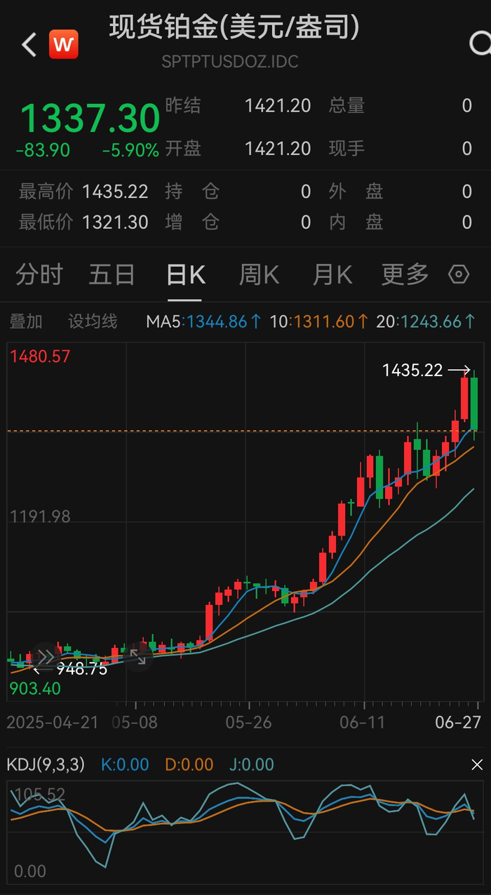 黄金与铂金近期的市场表现,似乎正在初步印证上述担忧。当地时间6月27日,国际贵金属期货普遍收跌,其中,COMEX黄金期货下跌1.85%,收报3286美元/盎司。现货铂金则遭遇更猛烈抛售,单日暴跌5.90%,收于1337.30美元/盎司。