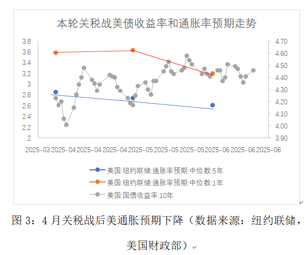 二是长期通胀预期,与直觉有所区别的是,10年期美债收益率在2020年4月关税战后的上升过程中,长期通胀预期反而是下降的(图3),从3月的3.58%降至5月的3.2%,通胀预期下降的幅度明显高于期限利差。