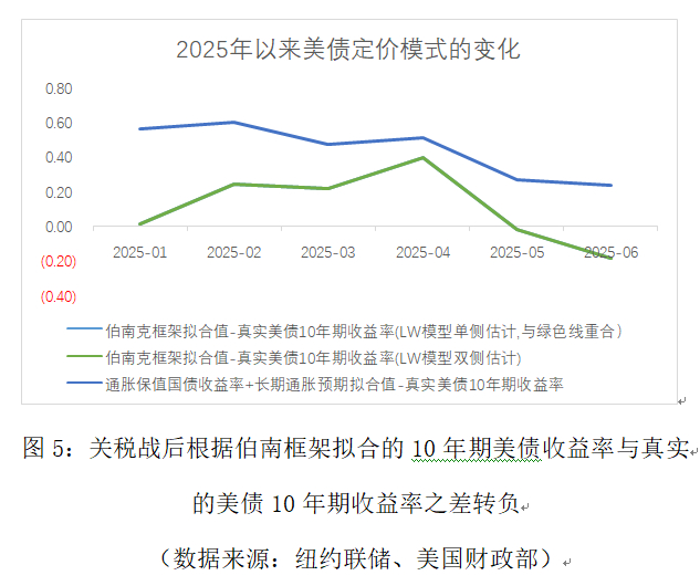 进一步,我们应用伯南克框架,使用纽约联储的两种模型(LW模型和HLW模型)的三种估计(HLW模型单侧估计、LW模型单侧估计、LW模型双侧估计)方式计算出的自然利率,纽约联储的5年消费者通胀预期中位数,和期限利差拟合删去在历史上拟合值大幅偏低的HLW模型单侧估计,我们发现在关税战前后,真实的10年期美债收益率与拟合的10年期美债收益率的差值下行至负值,意味着在短期内,美债的定价模式发生了变化,拟合值与真实10年期美债收益率的差值显著减小了。这说明,真实的10年期美债收益率中出现了一个伯南克框架不能解释的收益率上行因素。