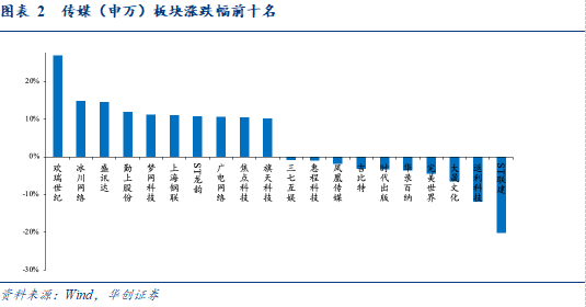 从个股看,联欢瑞世纪(26.89%)/冰川网络(14.86%)/盛讯达(14.64%)/勤上股份(12%)/梦网科技(11.17%)领涨。ST联建(-20.26%)/返利科技(-11.89%)/大晟文化(-6.48%)/完美世界(-4.5%)/华录百纳(-3.6%)领跌。