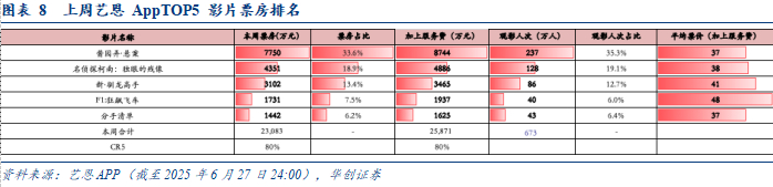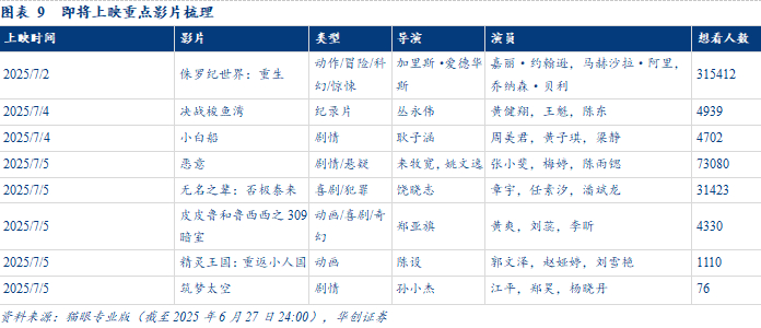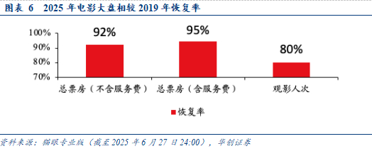 根据猫眼专业版,截至6月27日,2025年电影大盘实现票房(不含服务费)260.77亿元,观影总人次6.31亿人;2019年同期电影票房为282.72亿,观影总人次为7.87亿人。复苏节奏看,票房大盘已恢复约92%,观影人次已恢复约80%。