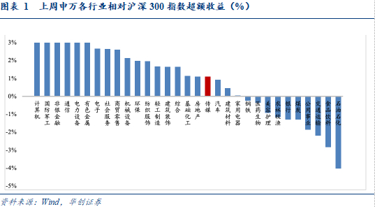 上周传媒(申万)指数整体上涨3.06%,同期沪深300指数整体上涨1.95%,板块跑赢沪深300指数1.11%,位列所有板块第18位。