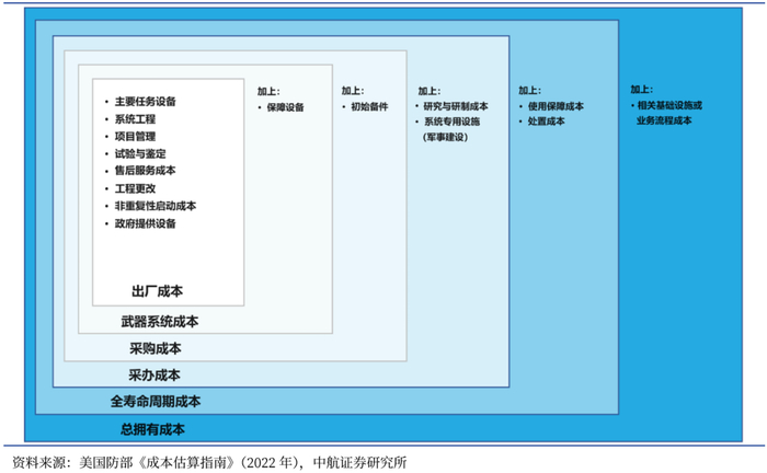 从成本视角而言,根据不同层次划分,武器装备成本可分为体系成本、武器装备全寿命周期成本、供应链采购成本等三类。