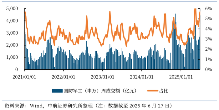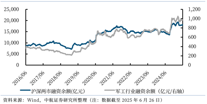 截至2025年6月26日,军工行业的融资余额合计977.96亿元,比上周环比上涨0.17%,占两市融资余额比例为5.37%。