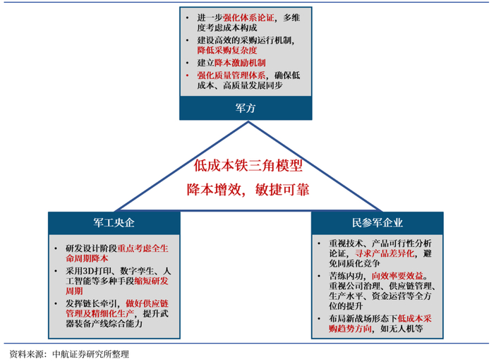 武器装备体系的成本控制需要各类主体积极参与其中,最终用户军方、产业链链主军工央企、配套供应商民参军企业结合自身的特点和优势,在低成本中发挥作用,共同构成低成本化铁三角模型,并追求建立降本增效、敏捷可靠武器装备体系的一致目标。