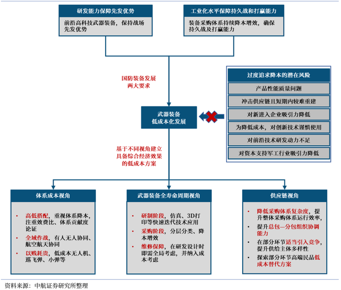 高精尖武器装备保障战场先发优势、高水平国防工业能力保障持久战及打赢能力,这是国防装备发展的两大要求。如何在有限资源下,应对新时代战场的变化,寻求低成本、高质量发展的装备体系成为军工行业核心课题。