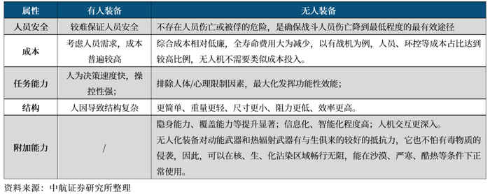 无人化装备区别于有人装备,类似无人化生产,有显著的优越性与劣势。无人化生产相较于有人生产具有安全性、经济性、效率性、耐受性等多重优势。类似的,无人化装备在人员安全、成本、任务能力、附加能力有具备类似显著的优势。