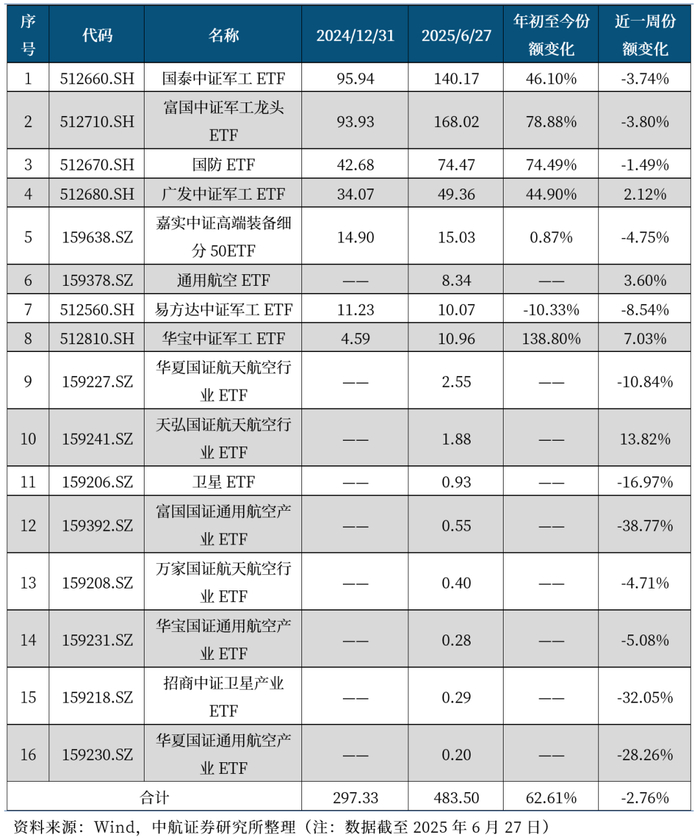 ① 资金面上,被动增量资金大量流入。2025年以来,军工领域(含低空经济、商业航天等大军工领域)的主题ETF规模由年初的297.33亿元增至483.50亿元,增幅超过60%。份额方面,规模较大的国泰中证军工ETF(+44%)、富国中证军工龙头ETF(+81%)、国防ETF(+74%),广发中证军工ETF(+43%)的份额均较年初高速增长(具体数据见正文4.2节)。大军工主题基金,时隔多年密集发行,跟踪低空经济、商业航天等大军工主题指数的多个ETF也在2025H1集中发行,当前合计规模已经超过15亿元;