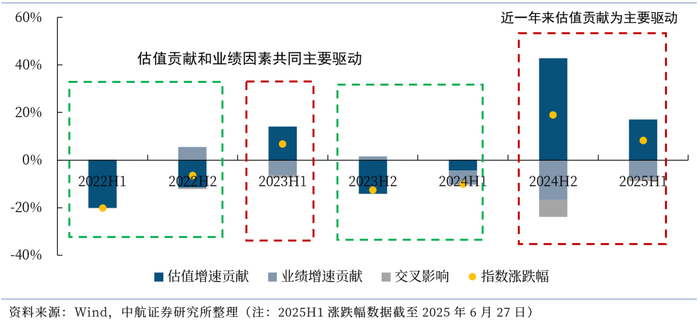 如下图所示,按照半年度拆分来看,2022年以来,军工行业(申万)半年度涨跌幅分别为-20.05%、-6.57%、6.76%、-12.69%、-10.03%、19.01%以及8.28%(2025H1数据截至6月27日)。军工行业自2024年下半年以来,走势呈现震荡上行态势,其主要驱动因素为估值驱动,即“拉估值”。