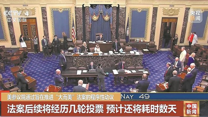 美国国会参议院当地时间28日晚以51票赞成、49票反对的表决结果,完成一轮针对特朗普力推的大规模减税及支出法案的程序性投票,批准继续推进该法案在参议院的立法程序。
