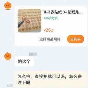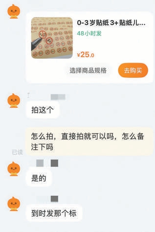 还有的商家“偷梁换柱”,用其他商品链接代替“3C贴纸”售卖。记者此前加购了一款“3C贴纸”,27日晚间商品显示已下架。但当记者咨询时,商家却表示“明天就有货”,并询问记者购买的数量。第二天,商家发来另一款普通的儿童玩具贴纸链接,并称只要拍下这一链接,后续会按“3C贴纸”发货。
