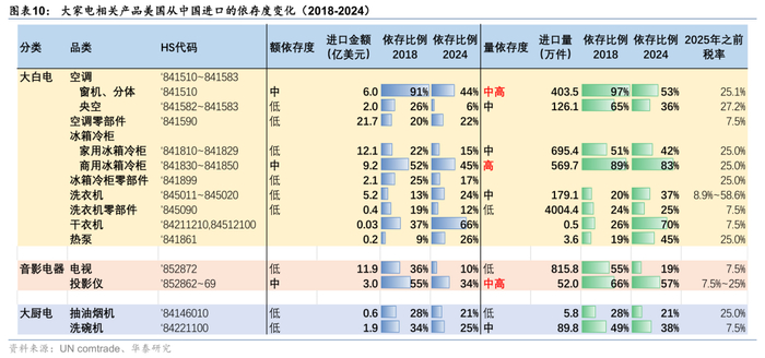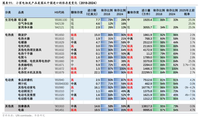 2)小家电品类整体美对华依存度较高。其中,电热类、电动类小家电产品中大量存在量依存度超过90%的品类,更有微波炉、电熨斗、多士炉、电热饮水机及其他、电动剃须刀的依存度逆势提升。我们认为,一方面,在特朗普1.0时代,小家电产品的额外关税比例不高,并没有像大家电产品一样征收25%的额外关税;另一方面,大多数小家电产品标准化程度较低,在海外缺乏上游产业链配套的前提下,海外生产基地的经营效率并不占优势。