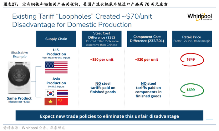 关税推动的产品价格上涨或随着库存消化逐步显现,我们预计,随着不同产地产品成本变化,美国家电零售商和消费者或更倾向于采购具备美国本土产能的品牌(如Whirlpool\海尔旗下GE等),也将推动制造企业改为采用采非钢铁/铝等金属材料。