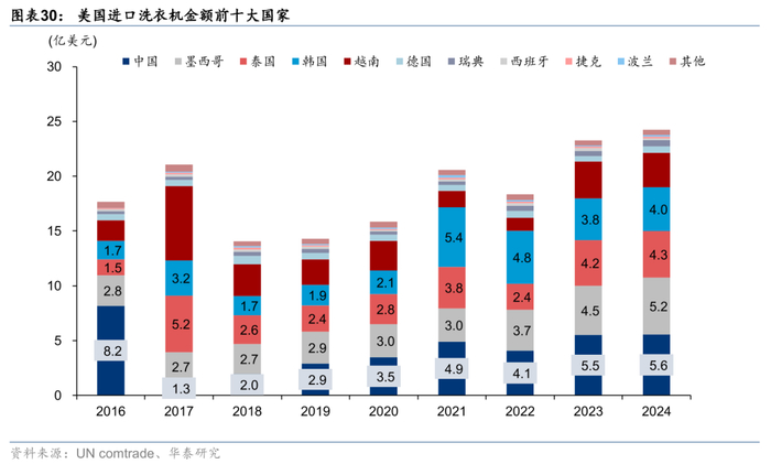2024年美国进口的洗衣机及零部件(HS代码8450)合计金额为24.2亿美元。TOP10进口国中,各国自2018年低点后有所恢复(2017年美国对进口洗衣机产品启动了“全球保障措施”调查,对中国出口的洗衣机征收高额双反税;2018年开始对全球执行洗衣机保障性关税,120万台内征收20%;超出部分征收50%)。根据产业在线,2024年美国本地洗衣机产销比超过74%,美国本地产量相对充足。