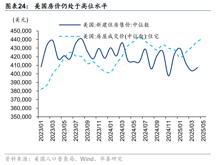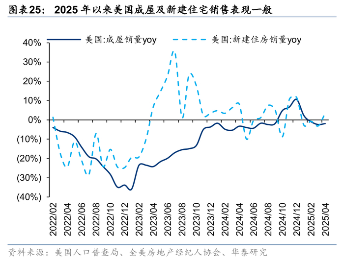 房价处于高位,美国楼市仍面临一定不确定性。住宅销售带动的家电销售角度来看,目前美国住房可负担性偏低(华泰地产《美国楼市月度跟踪:新屋成屋表现分化,成屋库存有所增加》-20250611),美国房价仍处于高位,且长期抵押利率也较高,高房价及高利率依然限制了需求的释放。