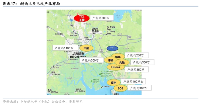 2024年美国进口的电视整机(HS代码845072)合计金额为118.3亿美元。TOP10进口国中,墨西哥占比大幅领先(2024年占比约为76%),而越南增长快速,19-24CAGR为+61%。自中国进口规模已不足12亿美元,19-24 CAGR为-21%。