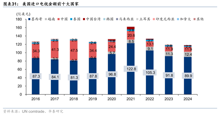 美国电视进口格局:墨西哥大幅领先、越南快速成长
