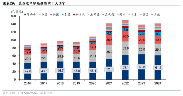 2024年美国进口冰箱冷柜等制冷设备及零部件(HS代码8418)合计金额约为141.6亿美元。TOP10进口国中,泰国、韩国增长较明显,19-24 CAGR分别为+41%/+10%。而墨西哥为最大进口来源地,2024年进口规模约为61.1亿美元(19-24 CAGR为+5%),而自中国进口规模仍接近30亿美元,18-24 CAGR为+2%。
