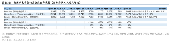 家电零售企业预期市场需求温和。美国本土零售企业对全年展望相对稳健。其中,Best Buy 面临关税、渠道压力及终端消费疲软,家电业务表现较弱,Home Depot 与 Lowe’s 则依赖家电作为装修项目的一部分,表现相对更稳定。