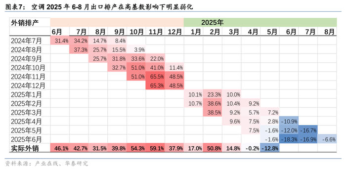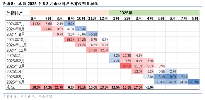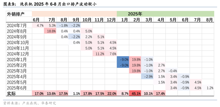 直接出口面临关税的短期冲击,叠加海外补库存需求回落(均有较高的增速基数),产业在线预计空调、冰箱工厂出口排产6-8月持续存在压力。洗衣机相对基数压力略小于空冰产品,6-8月呈现高位盘整。