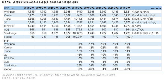大白电制造企业预期关税有利于本土制造企业。北美大白电龙头惠而浦(WHR US,未覆盖)Q1FY25收入同比下滑19.4%(主要为欧洲分部分拆),实际可比收入同比+2.2%(且北美收入剔除汇率影响后同比+0.1%)。且公司预计新的关税政策将更好地支持美国制造业,并预期2025年全年可比收入同比+3%。