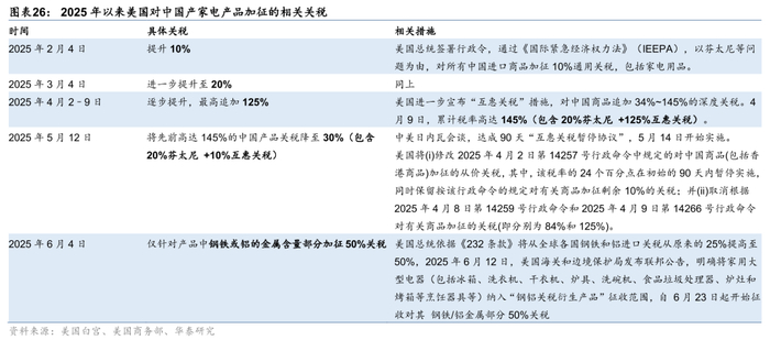 关税多重压力,利好具备美国本土产能企业。一方面,美国自2025年2月以来,针对中国产产品大幅加征关税,直到5月12日中美日内瓦会谈,将先前高达145%的附加关税降至30%,同时24%的互惠关税90天暂免。另一方面,美国自2025年6月23日开始,对所有国家(包含中国)的部分家电产品中钢铁/铝金属部分加征50%关税。