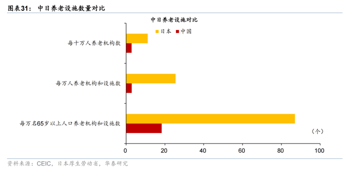 从养老机构数量来看,2024年末我国有养老机构4万个,养老机构和设施40.4万个,但人均占有情况亦远低于发达国家。具体而言,我国养老机构建设密度明显偏低:中国/日本每万人对应养老机构和设施数分别为2.9个/25.5个,日本每万人对应机构数达中国的8.8倍,每万名65岁以上老年人对应机构数达中国的4.8倍。
