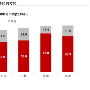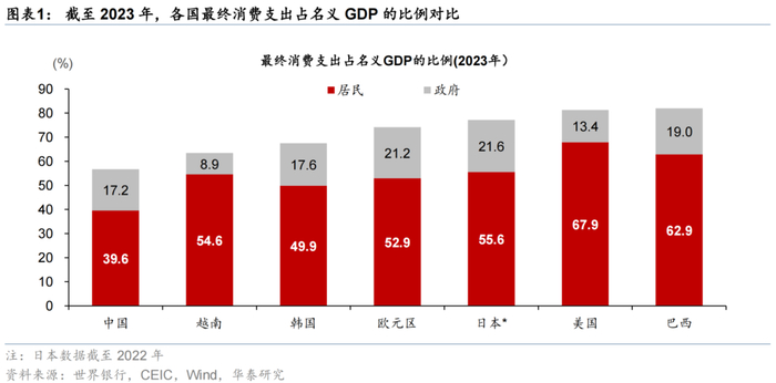 中国的消费率较全球发达国家水平偏低,截至2023年,以支出法衡量的中国最终消费支出占名义GDP的比例约为56.8%,明显低于其他发达国家,较巴西、越南等新兴市场国家也偏低。中国名义GDP中最终消费支出的占比自2000年的46.8%逐步回落至2010年的34.6%左右,此后小幅回升至2019年的38.4%,受新冠疫情影响在2020年再度小幅回落,截至2023年录得39.6%,但仍明显低于主要发达国家。截至2023年,中国最终消费支出中,居民消费占GDP的比例约为56.8%,明显低于日韩、欧美等发达经济体65%-81%的水平;相对来说,中国政府消费占GDP的比例和其他发达国家较为接近,2023年录得17.2%、高于美国的13.4%,略低于韩国的17.6%。