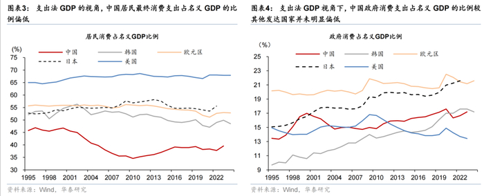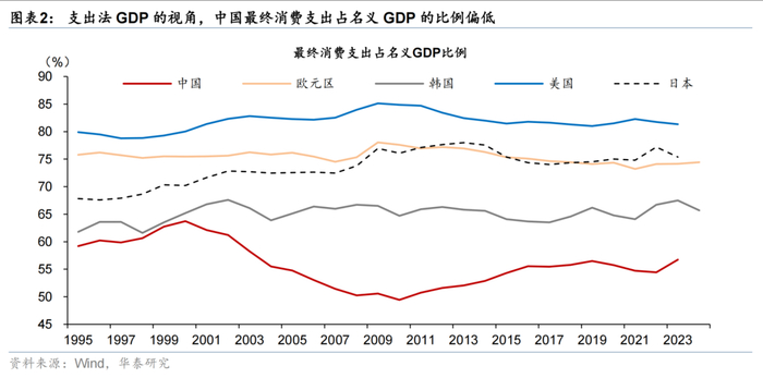 截至2023年,以支出法衡量的中国最终消费支出占名义GDP的比例约为56.8%,低于日韩、欧美等发达经济体65%-81%的水平。但可能由于统计口径、估算方法等差异存在低估:1)住房消费采用成本法估算,较虚拟租金的估算方法偏低;2)政府向居民提供的公共服务未计入家庭消费支出。