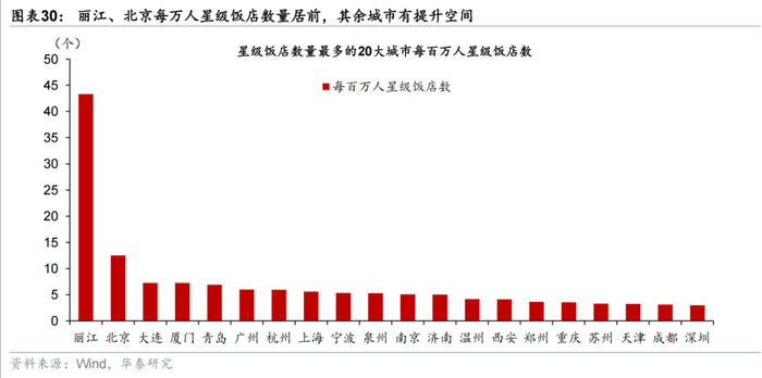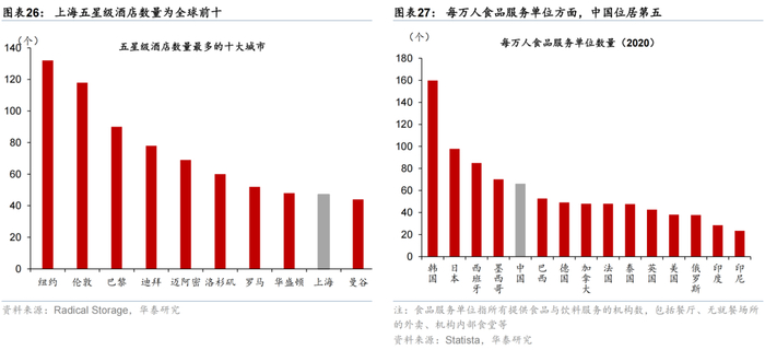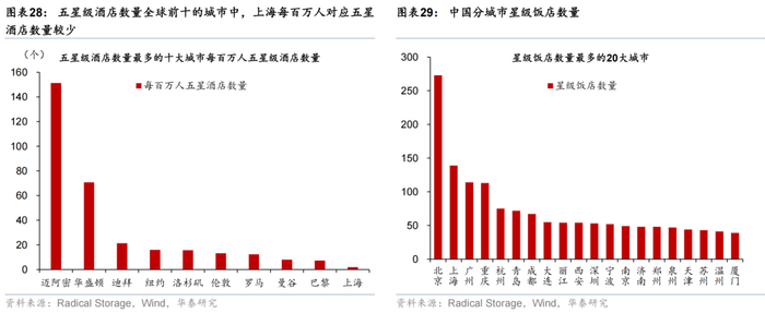 酒店方面,全球五星级酒店数量最多的十大城市,中国仅上海上榜,位列全球第9,中国各大城市,特别是一线城市的星级酒店设施投资有较大增长潜力,北京/上海五星级酒店对标纽约/伦敦仍有翻倍空间。