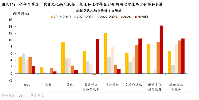 从整体趋势上看,城镇居民消费性支出中占比较高的食品、居住分项近年来增速有所放缓,而服务性支出占比虽然偏低,增速表现亮眼。具体而言,食品和居住分项支出占比相对较高,2024年全年/2025年1季度分别占城镇居民消费性支出的28.8%/30.6%,但增速分别较2015-2019年均复合增长的5%/9.4%回落至今年1季度的2.3%/1%。服务性支出占比虽然偏低,但增速表现亮眼,如交通通信和教育文化娱乐服务分项支出今年1季度占比13.6%/10.8%,但分别录得10.4%/14.3%的同比增速、高于2015-2019年均复合增速的4.3/5.6个百分点。此外,家庭设备用品及服务受“以旧换新”政策提振增长较快,今年1季度较去年全年的-0.4%大幅回升至10.2%。